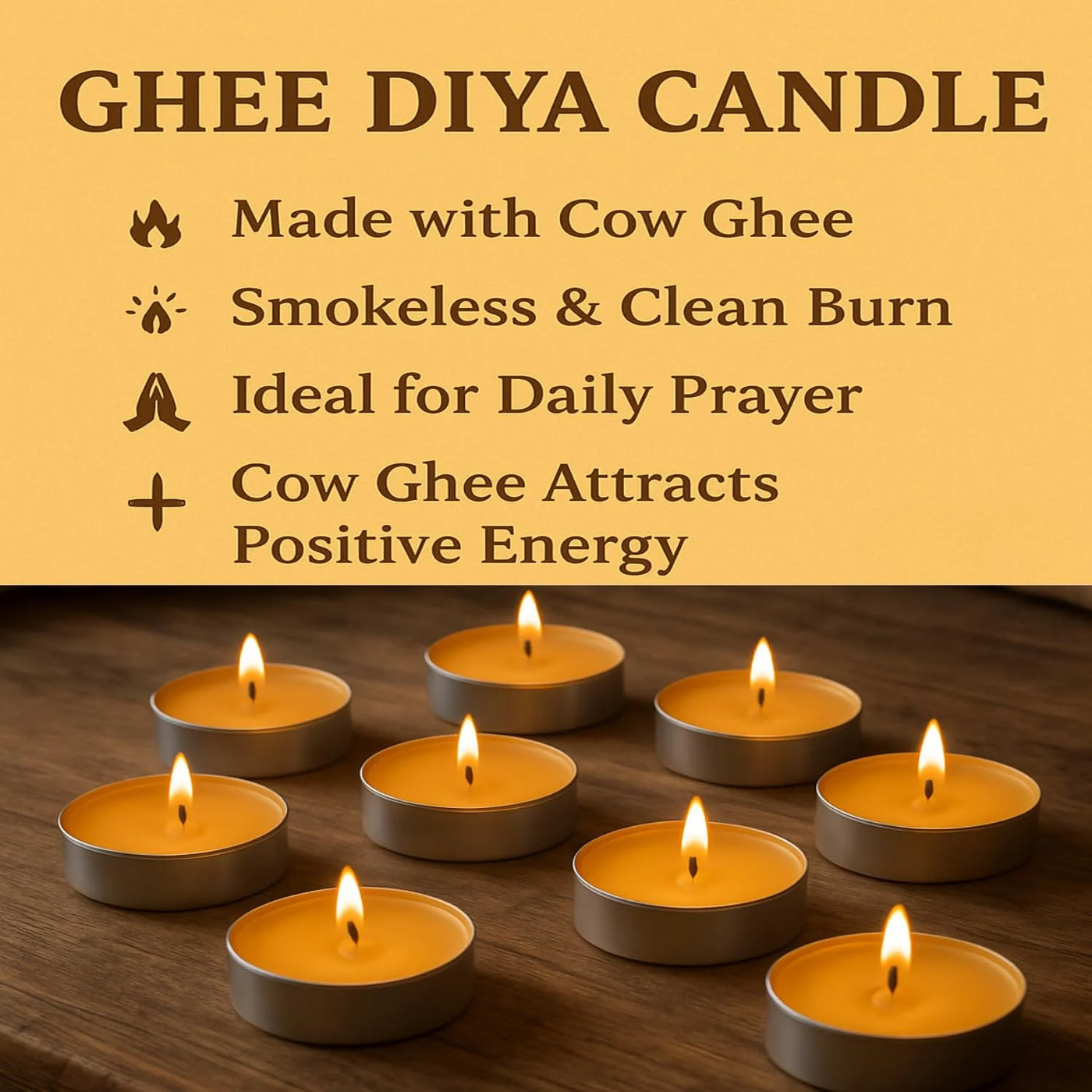 Ksma Tealight Candle (Set Of 25) (Ghee Scented) Illuminate your sacred spaces with he divine glow of our Pure Ghee Diya Candles. Made from 100% pure cow ghee and cotton wicks, these ready-to-use diya candles bring ease, purity, and tradition to your daily rituals. Each diya is handcrafted to ensure clean, smokeless burning and a steady flame, ideal for use during puja, aarti, meditation, and festive occasions like Diwali, Navratri, or Shravan. Simply place the diya in a holder and light – no additional oil or ghee needed.